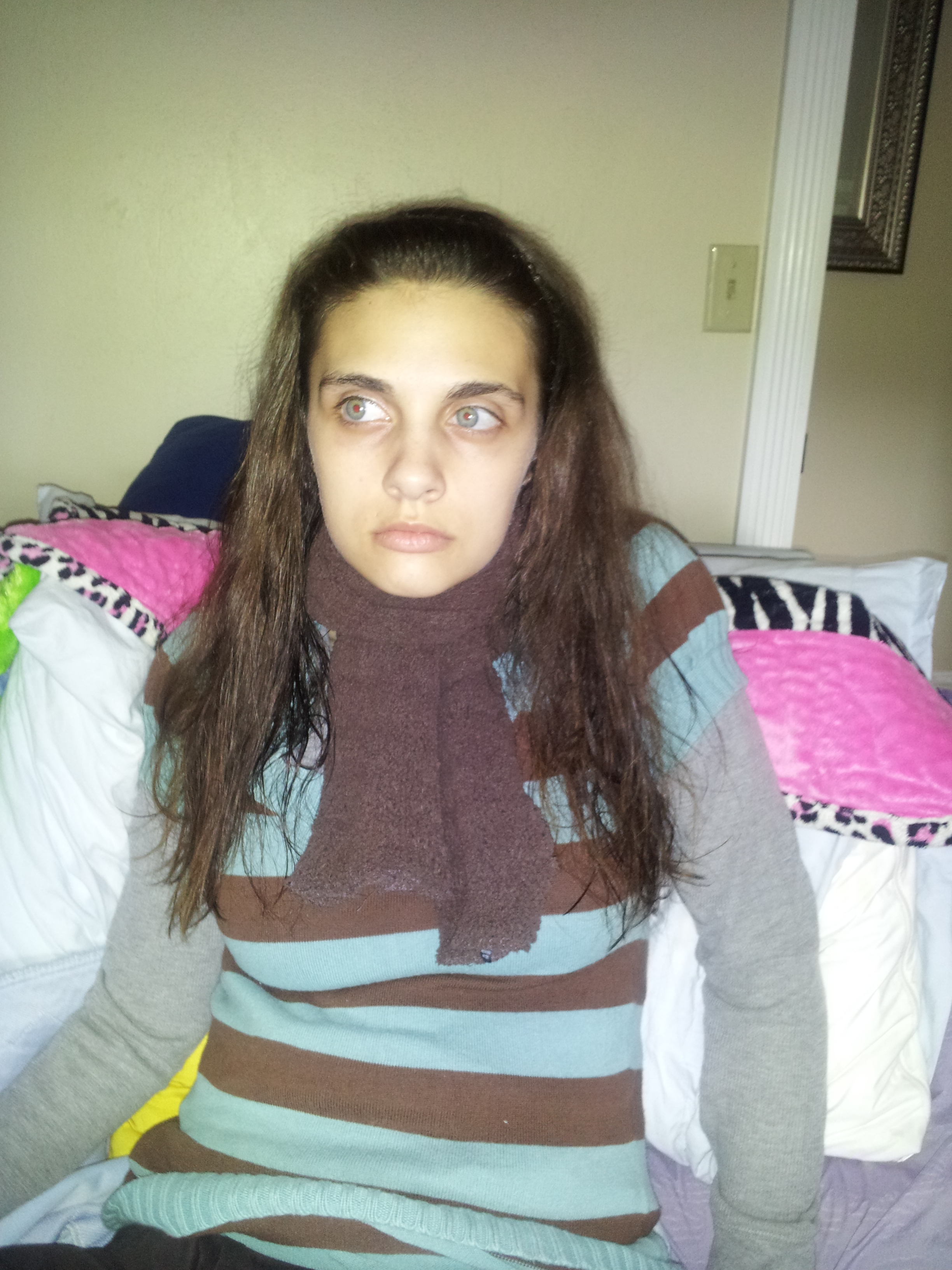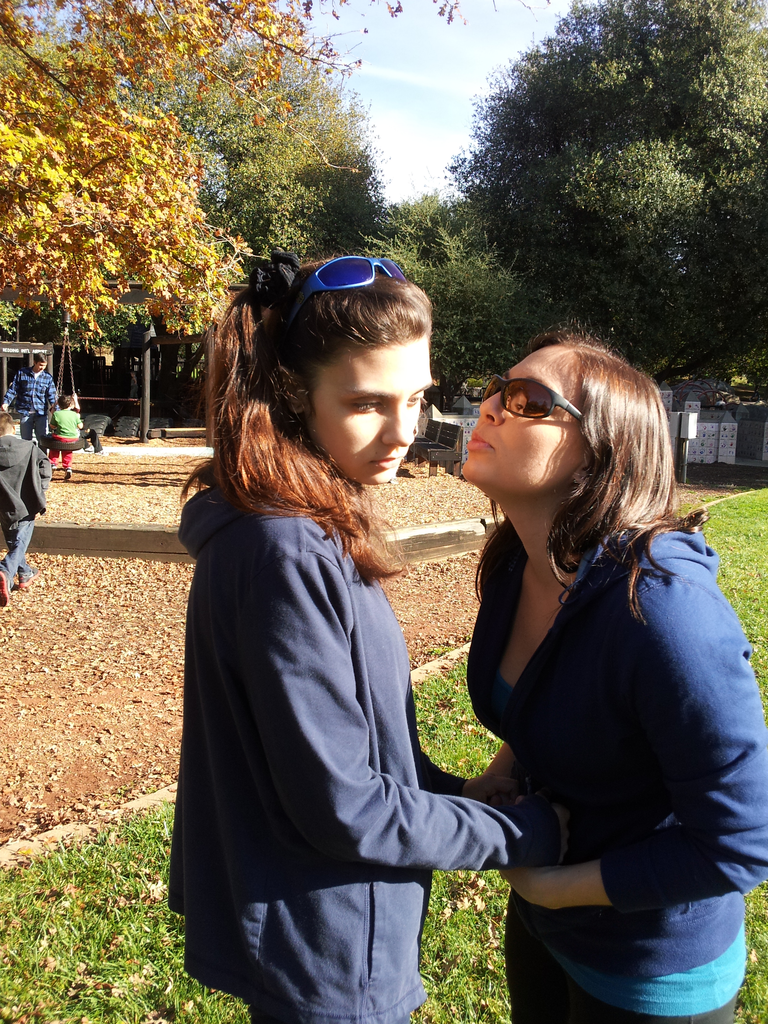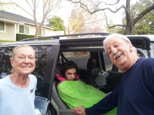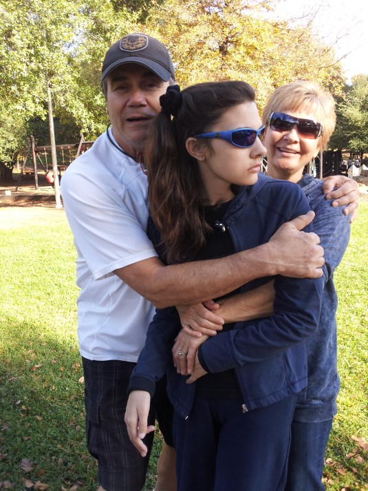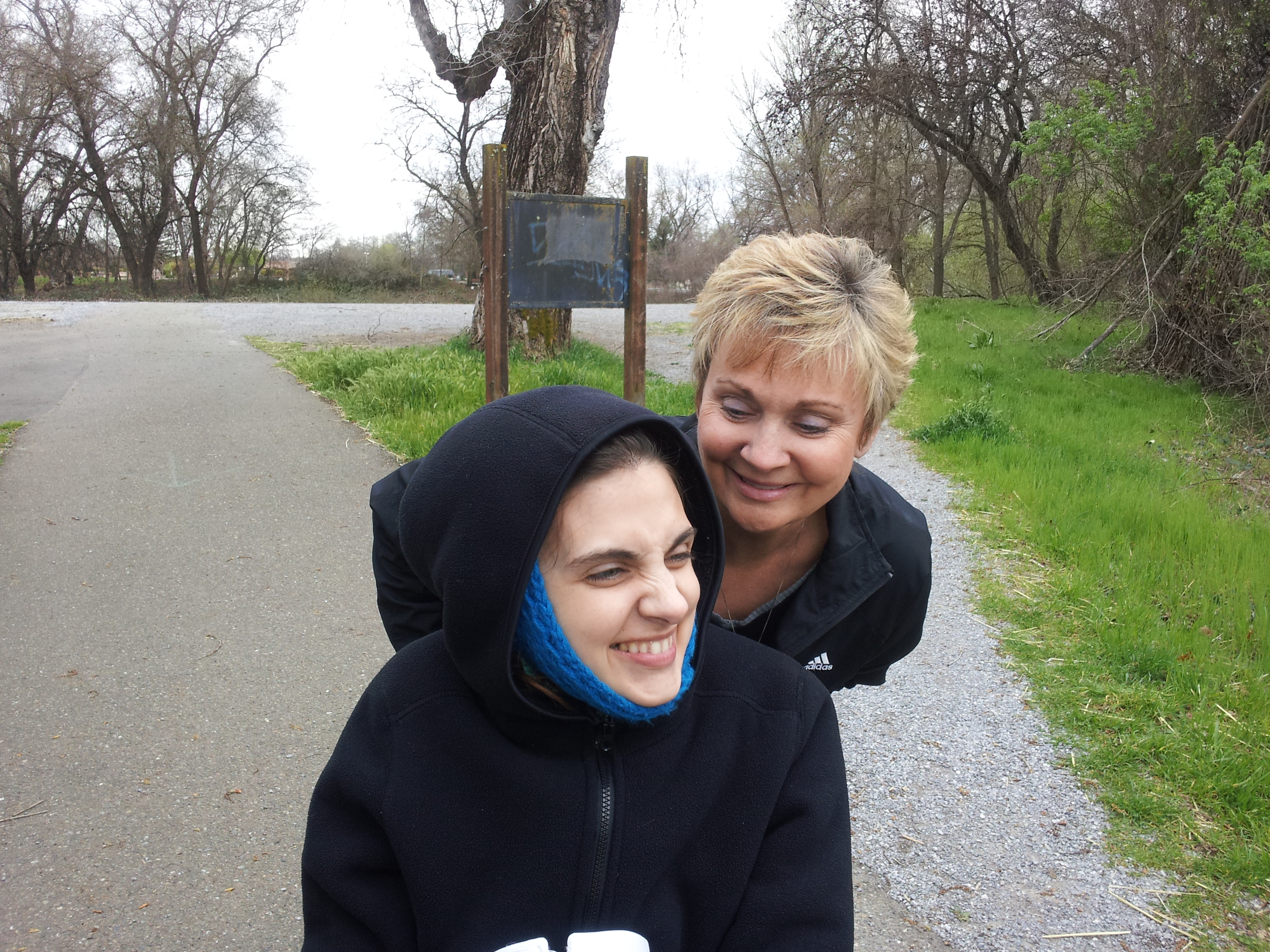 The new drug Aricept is really helping Trina stay more active and smiling (full on laughing) a lot of the time. This makes it harder work for us but WORTH it to see her have such joy. She had a new feeding tube put in this month and that went real well. She has a new friend come over a lot named Lexus and Trina just adores her! We have had a couple friends over too that really capture her attention. We learned she just loves olive and brown skin! Just makes her smile a big smile every time. This is not a racist statement – she loves all types, but for some reason she is drawn in by our friends with extra color 🙂 The new house is working great for Trina…lots of room to practice moving around. However, she is wobbly as ever and we have to really watch her every second. When the weather is good we are going for daily walks at Anderson River Park and that is awesome. Steve and I take turns pushing her wheelchair and make it great days out in the sun and rain. We bought Trina thermal clothing and weather proofed clothing so that we could always get exercise with her. It is great stimulus too. She still does not talk but makes a lot of expression sounds. Thanks for your prayers everyone. Thanks for checking in, too. I am attempting to finally add more pictures of our recent times…hope you enjoy. Her sisters should be coming soon for a visit and I will have more pics then for sure !!!